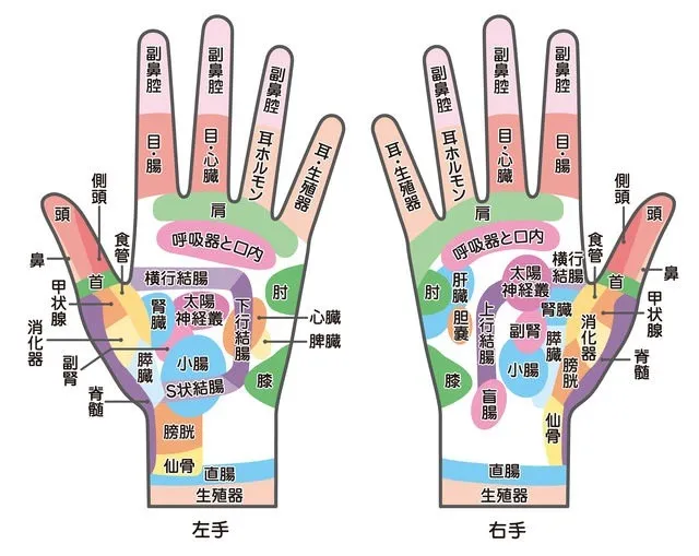 足裏のリフレクソロジーはよく知られていますが、手のひらにも反射区があるとされています。